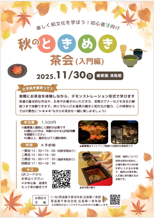 十一月三十日、縮景園・清風館にて「秋のときめき茶会(入門編)」を開催いたします。